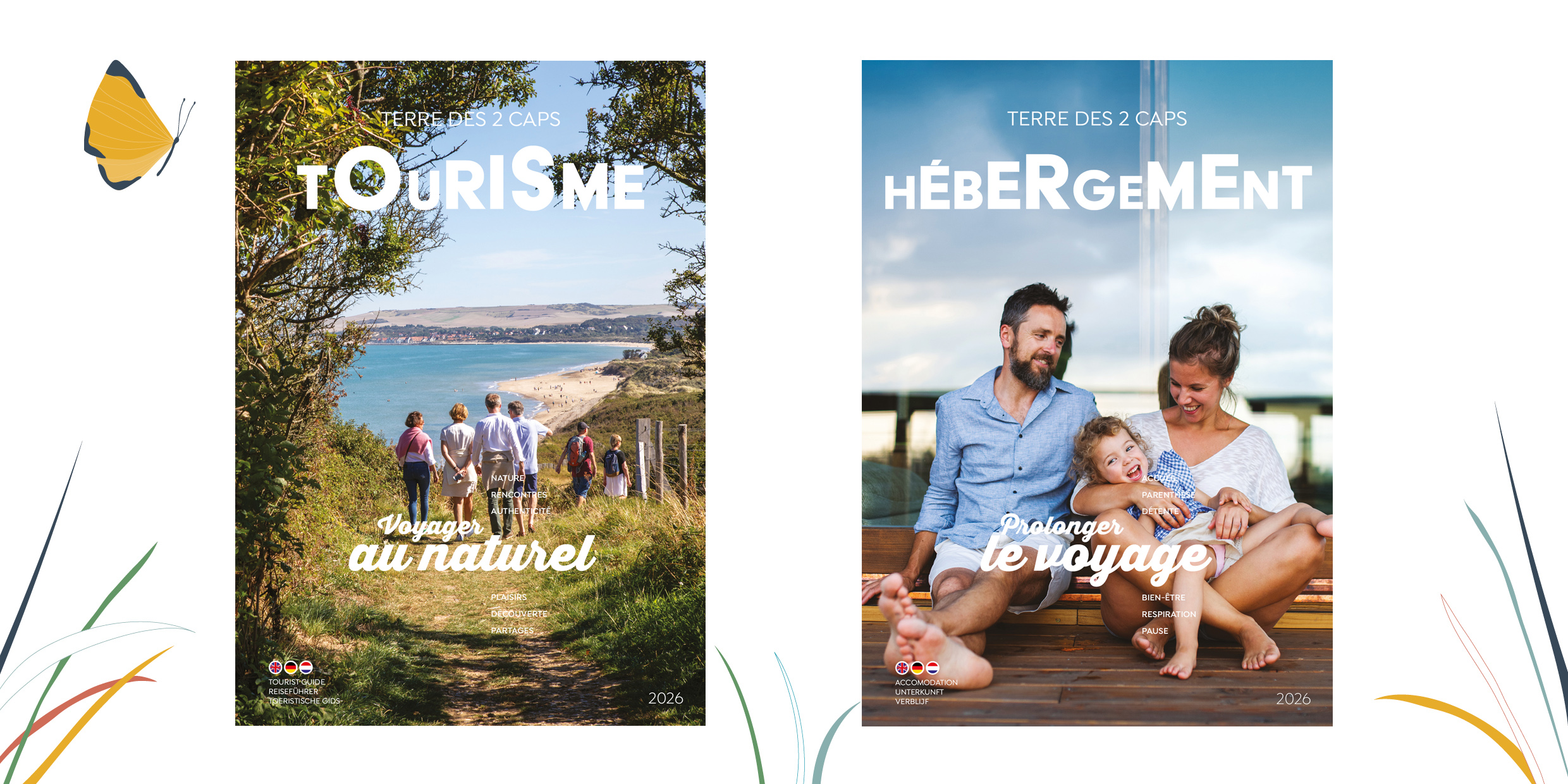 Des dessins colorés apportent de la gaieté et de la fraîcheur, tout en finesse, aux deux brochures touristiques de l’office de tourisme de la Terre des 2 Caps. Des détails amusants sur certains dessins amènent une touche d’humour sans être trop enfantin.